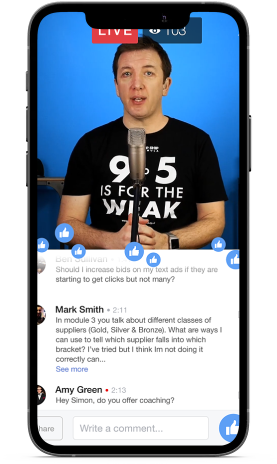 Every 2 weeks Simon hosts a Facebook Live call, you can ask questions, get feedback and even join the call as a speaker with your questions.